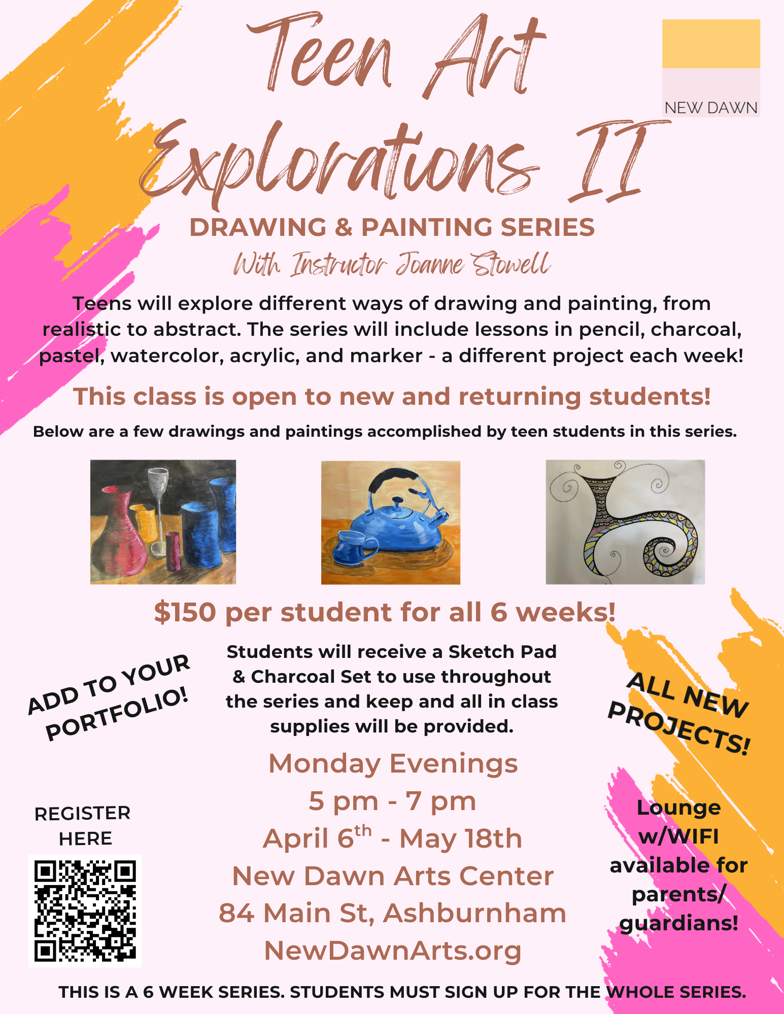 Classes will be held on Monday Evenings from 5 - 7 PM, April 6th - May 18th at New Dawn Arts Center.