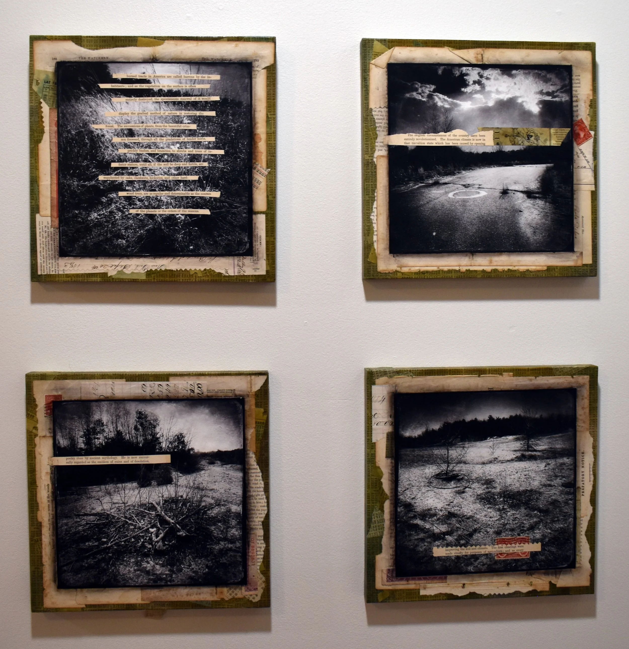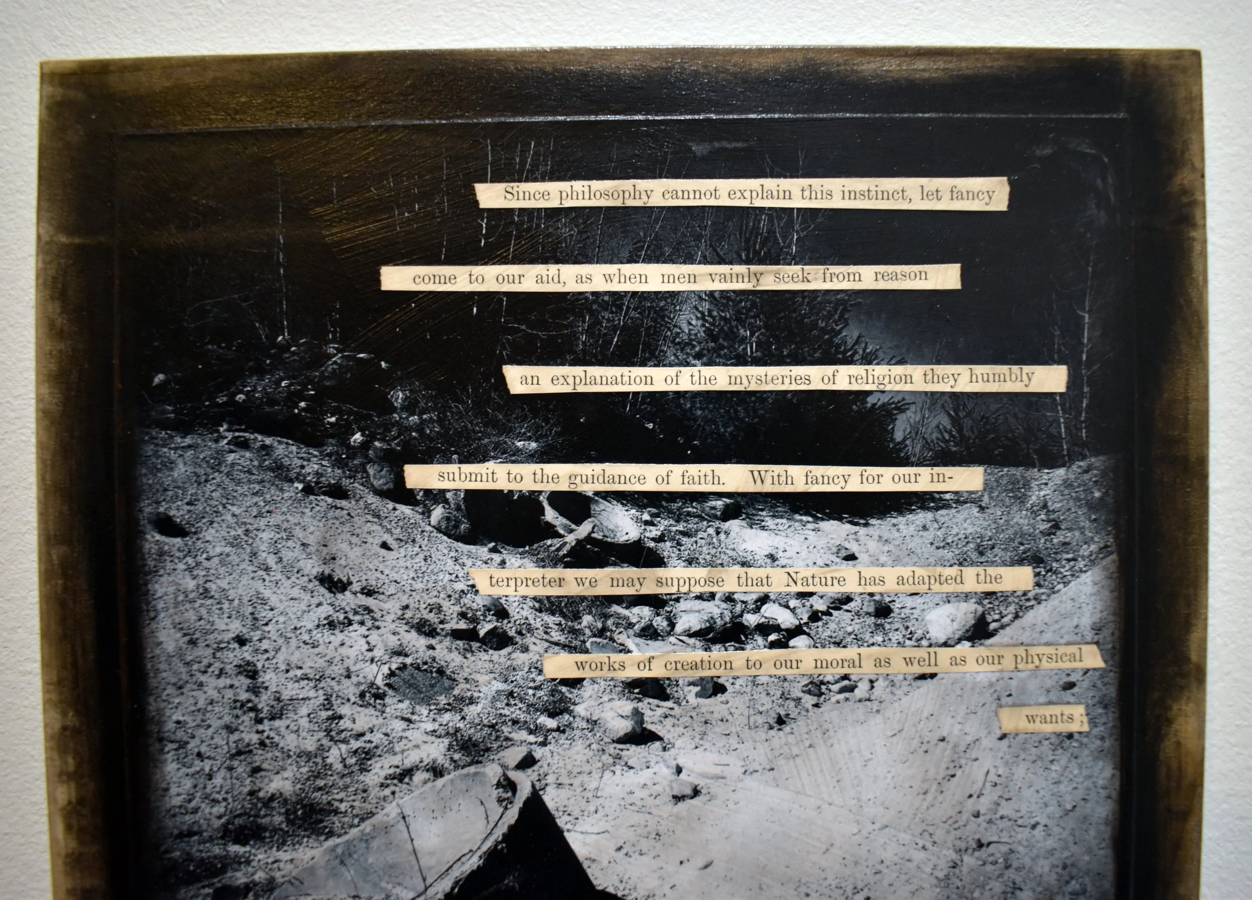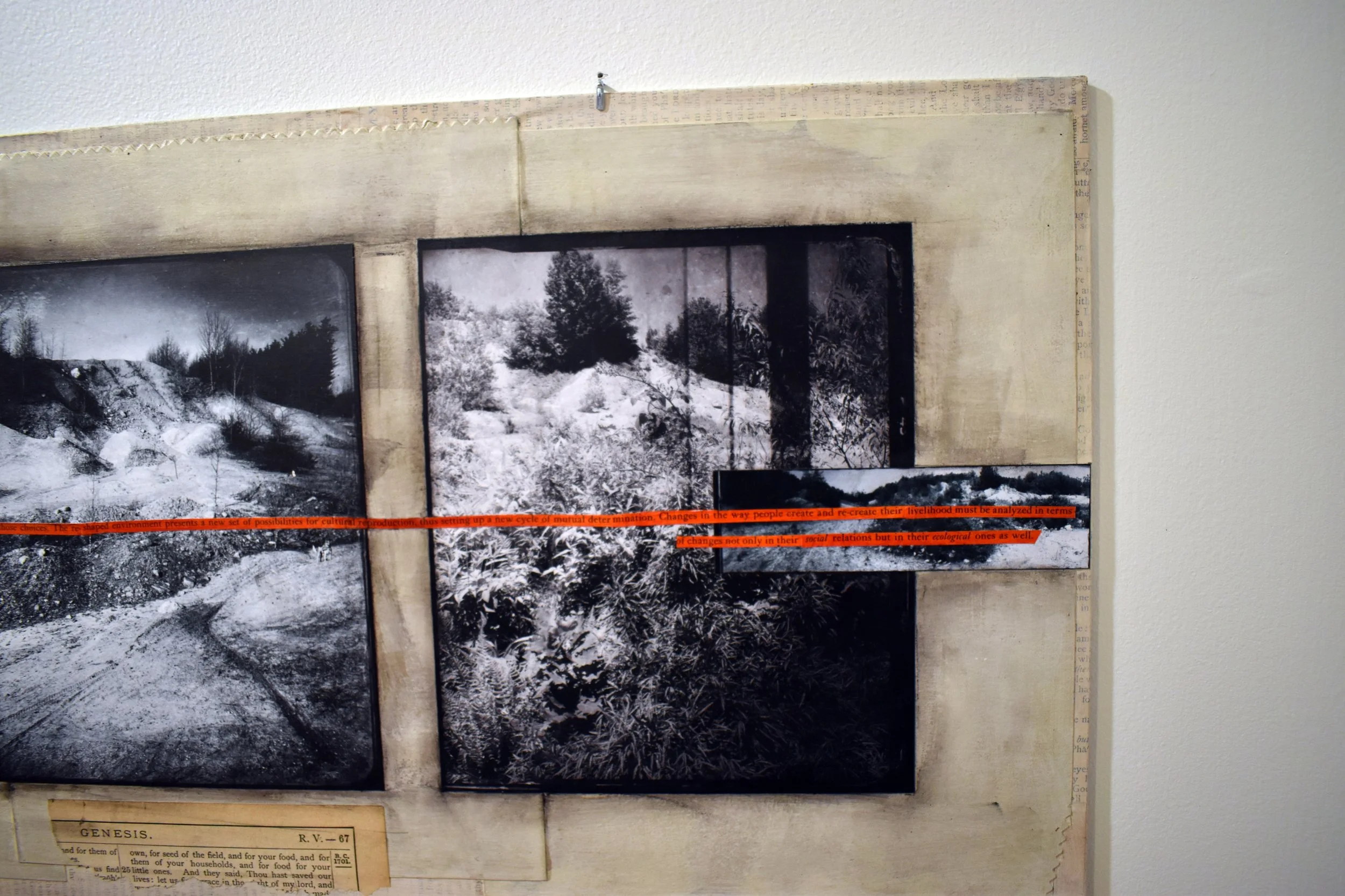 My work for this project is primarily photographic, combined with acrylic paint and pastels, and collaged with pages from antique bibles, celestial navigation charts, vintage prefab home catalogs, and the planning report for Keyes. I include excerpts from the writings of the nineteenth-century naturalist Wilson Flagg and contemporary environmental historian William Cronon as signposts tracking how our understanding of the local environment has changed over the centuries, and how this history shapes our experience of the land. My artwork is where I negotiate my own ambivalent feelings toward places like Keyes. Will our human nature ever allow us to feel truly at home in our natural habitat? I have no answer to this, but I believe it is crucial for our survival to dedicate ourselves to grappling with the question.